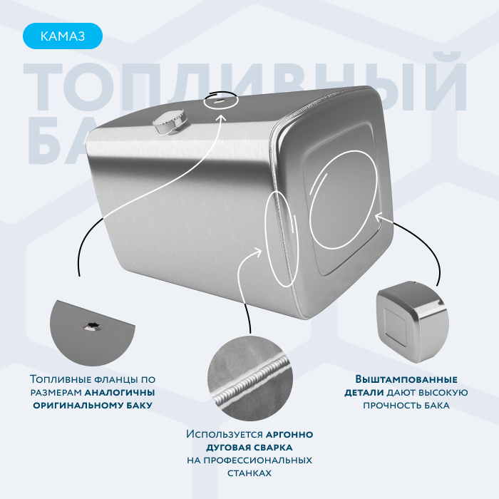 Алюминиевый бак не подвержен коррозии, что делает его более долговечным, а так же сбережет вашу топливную систему. Бак из алюминия в два раза легче стального бака, хотя он и изготовлен из листа увеличенной толщины в 2,5 мм. В конструкции предусмотрены цельные перегородки, которые проварены по периметру. Баки из алюминия так же оснащены заливной горловиной с самозапираемым непроливаемым клапаном (который становится барьером для разлива топлива, а так же становится защитой от попадания мусора в бак при открытой крышке) . Кроме того, однозначно что алюминиевый бак выглядит намного привлекательнее и дороже - где бак в том числе становиться и элементом тюнинга автомобиля. На алюминиеввые баки действует увеличенная гарантия - 36 месяцев.
