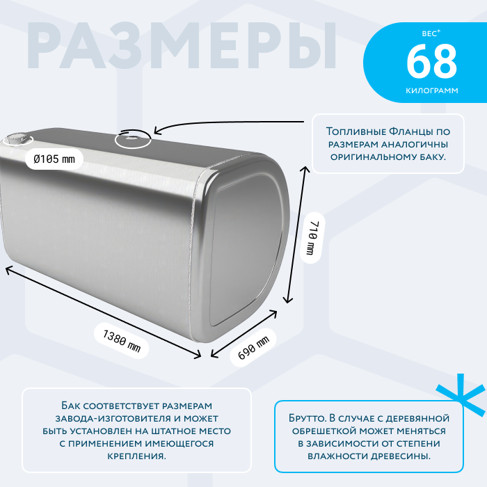 - Так же, если вы приобретаете алюминиевый топливный бак, он будет в деревянной обрешетке (для усиления защиты при транспортировке). При просчете веса и объема, цена за доставку может измениться по факту взвешивания на самом терминале транспортной компании. Так как деревянная обрешетка соответственно изготовлена из древесины, и она имеет свойство значительно набирать вес в зависимости от влажности окружающей среды.